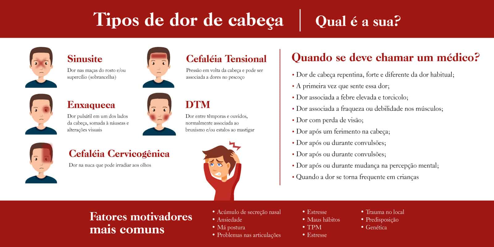 - Cefaleias Secundárias: A dor é sintoma de outra condição, como sinusite, problemas na articulação temporomandibular (ATM), lesões cervicais ou até condições mais graves. Nestes casos, o analgésico apenas mascara o problema real.